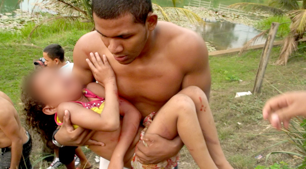 | Criança que foi projetada para fora do veículo sendo socorrida |