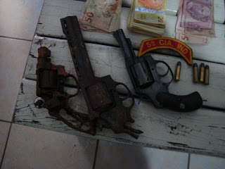 Foram encontrados em sua residência dois revolveres calibre 38 enferrujados e sem condição de uso, mas que poderiam ser utilizados para efetuar assaltos. Os mesmos são acusados de assaltar um estabelecimento comercial, localizado na Rua Bandeirante, Nº. 101, Bairro Tancredo.