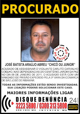 Informações sobre o paradeiro de JOSÉ BATISTA ARAÚJO ABREU, vulgo “CHICÓ” ou “JÚNIOR” devem ser repassadas ao Disque- Denúncia que funciona pelos números (3223 5800 – capital e 0300 313 5800 – interior), não precisa se identificar. O serviço funciona 24 horas.