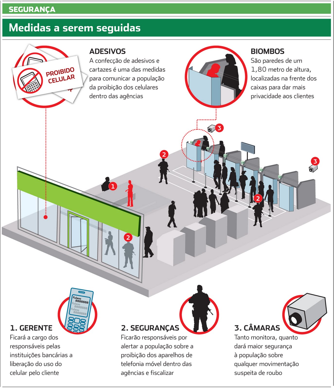 A Lei sancionada pela Assembléia também torna obrigatória a implantação de biombos de segurança, com 1,80mt ( um metro e oitenta) de altura, nos caixas das agências para garantir a privacidade dos usuários durante as movimentações financeiras.