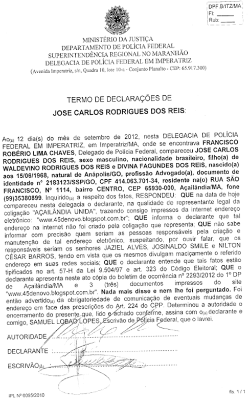 Foi entregue ao delegado da PF pelo Advogado, impressos do blog, além de boletim de ocorrência feito na Policia Civil em Açailândia aonde foi arrolado nomes dos suspeitos de serem proprietários ou conhecerem o mesmo.